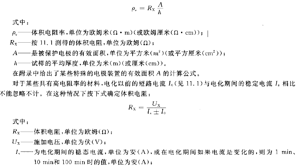 作为验收试验,按照有关规范的规定,使用一个固定的电化时间如1min后的电流值来计算体积电阻率。