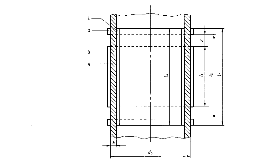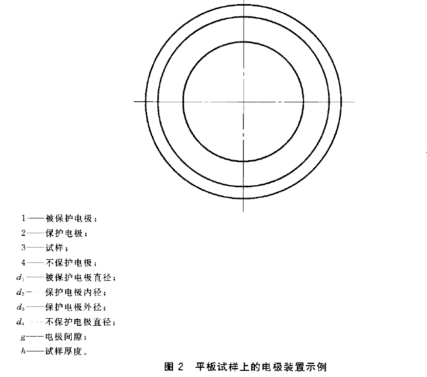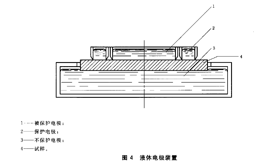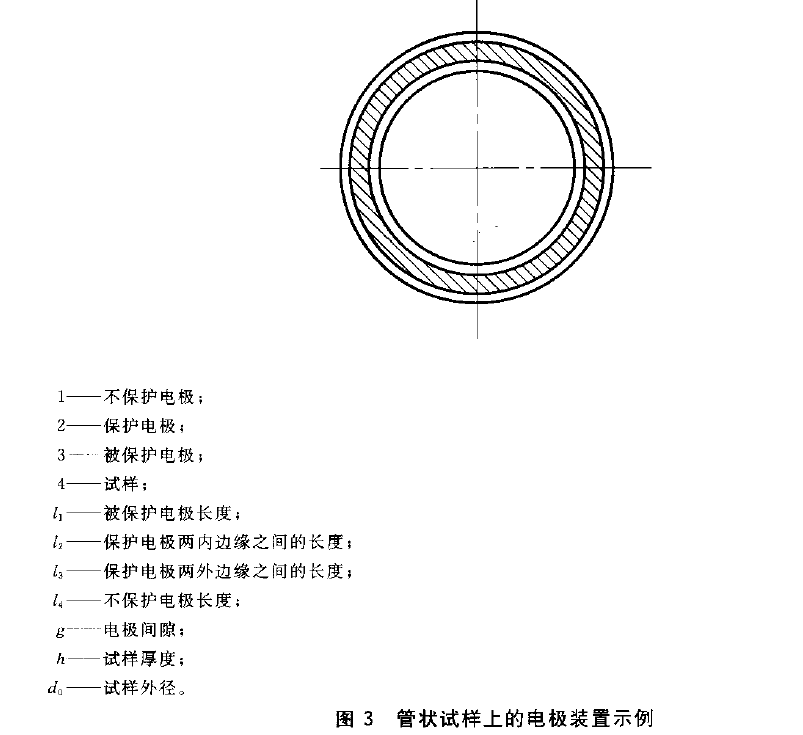 图2及图3给出了三电极装置的例子。在测量体积电阻时,电极1是被保护电极,电极2为保护电极,电极3为不保护电极被保护电极的直径d1(图2)或长度l1(图3)应至少为试样厚度h的10倍,通常至少为25 mm。不保护电极的直径d4(或长度l4)和保护电极的外直径d3(或保护电极两外边缘之间的长度l3)应该等于保护电极的内径d2(或保护电极两内边缘之间的长度l2)加上至少2倍的试样厚度。