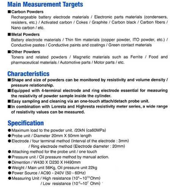 与阻抗率计Loresta-GX(MCP-T700),Hiresta-UX(MCP-HT800)连接,以测定广范围之粉体之低阻抗、高阻抗