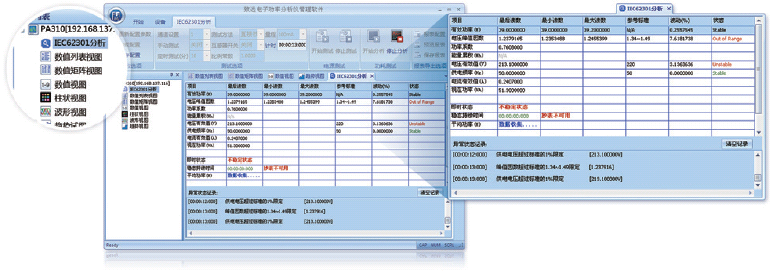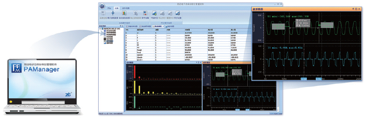 对于很多PA300系列功率计无法直接显示的测量项目,都可以通过PAM 软件实现测量与显示,如所有测量参数数值、各次谐波数据、谐波柱状图、趋势图以及波形图等。测试数据可以选择由USB、GP-IB、RS-232 或以太网通信接口上传到PC 端,并通过PAM 软件在PC端上实现同步显示和数据报表导出。