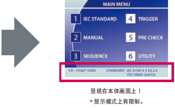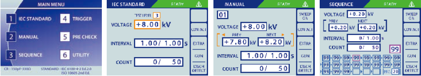 重新设计之前的操作性,变为更加容易使用操作简单。在IEC STABDARD上IEC标准上的试验等级被存储,所以只要选择试验等级就可以简单进行设定。在MANUAL上,可以设定电压和试验次数等,且可以记住设定条件。还有在扫描模式中设定也可以做到。SEQUENCE是可以读出在MANUAL里设定的条件来组合。其他,内置枪触发设定和消电装置的设定等各种功能。