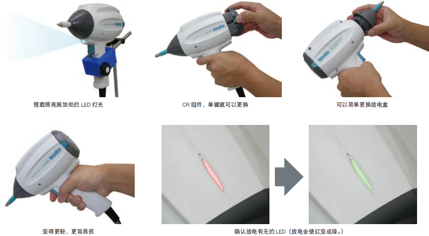 放电枪完全是从0的设计,实现轻量化和重心平衡。跟从前比变轻且重心平衡也改善的关系,不仅容易抓,还减轻了试验带给手腕的负担。请务必、抓在手上感触。还有、之前的空气放电时的放电有无的确认是较为困难,但是现在的放电有无的确认是除了试验器本体确认,在放电枪上的LED光也可以确认。其他,还有CR组件的单键更换,照亮静电施加处的LED光等多种功能。