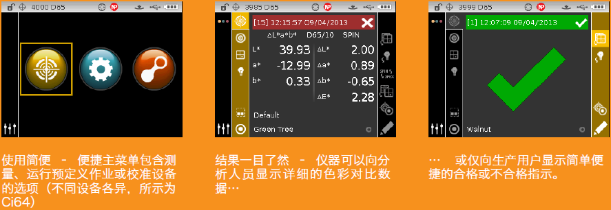 Ci64 Graphical Jobs™。车间和实验室人员可以通过设置工作模式,从仪器的彩色大屏幕上直观地观察,判定测量的采取点和采取方式,以便能精确、可重复地采集颜色数据。此工作模式有助于保证在批次之间、不同的生产线上以及单独的生产设施上,获得可靠的测量采集,进行统计过程控制。