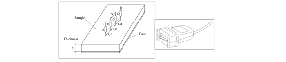 施加恒定电流在物体表面产生分布电场,探针感知电场大小,由相应数学计算公式可计算半导体、薄膜等材料电阻(Ω)、表面电阻(Ω/□)、体积电阻(Ω.cm)、电导率(s/cm)等电阻特性。